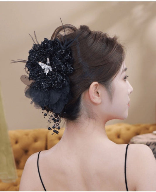 Elegant shiny silk butterfly rose tassel hair claw